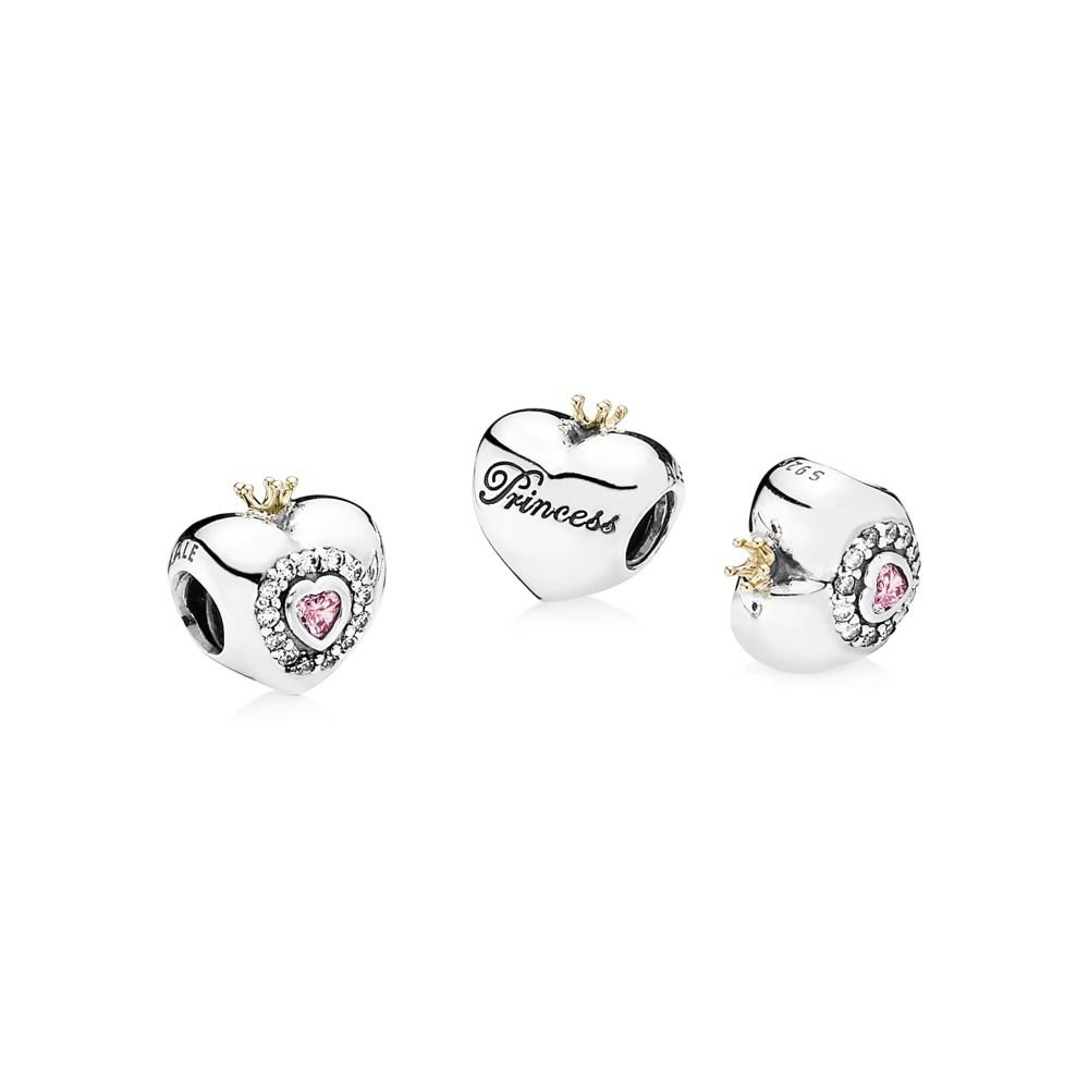 Il charm a forma di cuore, in argento Sterling 925, presenta una coroncina in oro 14k, una pietra di zirconia cubica rosa a forma di cuore e piccole pietre di zirconia cubica incolore.