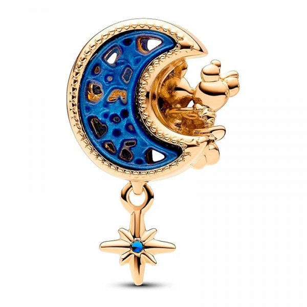 Il charm dispone di due elementi in madreperla in bioresina di colore blu scuro a forma di luna crescente, con un motivo a stella ritagliato sulla pietra su ciascun lato. Su questa luna crescente, Mickey Mouse e Minnie sono seduti in un abbraccio affettuoso, con le loro braccia protese l’una verso l’altra, simboleggiando l’amore eterno.